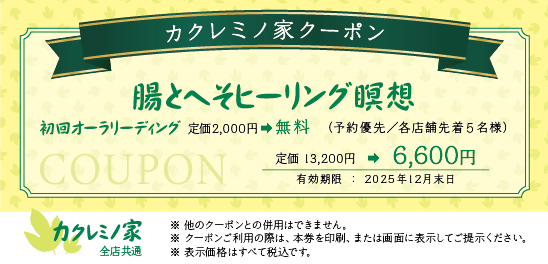 カクレミノ家では、様々なクーポンをご用意しています。 「クーポンを印刷する」ボタンからプリントアウトされたクーポンをご持参いただくか、 スマートフォンやタブレット等で直接お店のスタッフにクーポン画像をご提示ください。 また、他のクーポンとの併用はできませんので予めご了承ください。 2025年12月末日までの期間限定クーポンです。 ● オーラリーディング&パワーストーンブレスレット制作費 定価3,500円(税込)が1,500円(税込)になります。(石代別途/予約制/各店舗先着10名様) 2025年12月末日までの期間限定クーポンです。 ● チャクラリーディング&パワーストーンブレスレット制作費 定価4,500円(税込)が1,500円(税込)になります。(予約優先/石代別途/各店舗先着10名様) 2025年12月末日までの期間限定クーポンです。 ● チャクラブレイン瞑想 パーソナルレッスン体験 定価13,200円(税込)が6,600円(税込)になります。(予約優先/各店舗先着3名) 2025年12月末日までの期間限定クーポンです。 ● 生命電子ヒーリング瞑想 オーラを感じる瞑想体験費 定価13,200円(税込)が6,600円(税込)になります。(予約優先/各店舗先着5名) 2025年12月末日までの期間限定クーポンです。 ● 腸とへそヒーリング瞑想 初回オーラリーディング定価2,000円(税金) ⇨ 無料 定価13,200円(税込)が6,600円(税込)になります。(予約優先/各店舗先着5名様) 2025年12月末日までの期間限定クーポンです。 脊椎アロマヒーリング瞑想 初回オーラリーディング定価2,000円(税金) ⇨ 無料 定価16,500円(税込)が7,700円(税金)になります。(予約優先/各店舗先着3名様) ※こちらのクーポンは名古屋大須店ではご利用できません。ご了承ください。