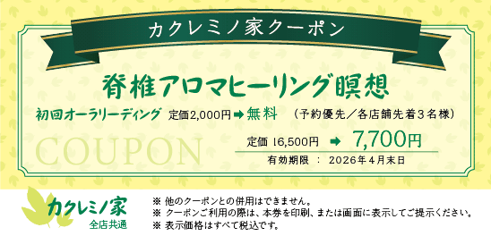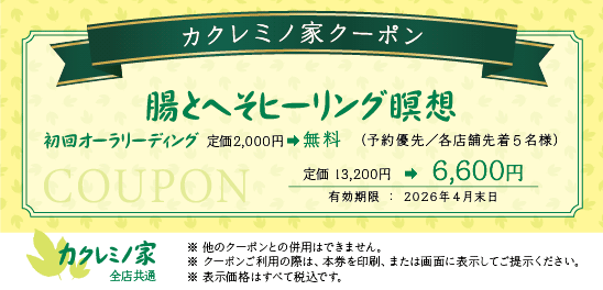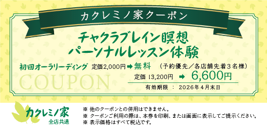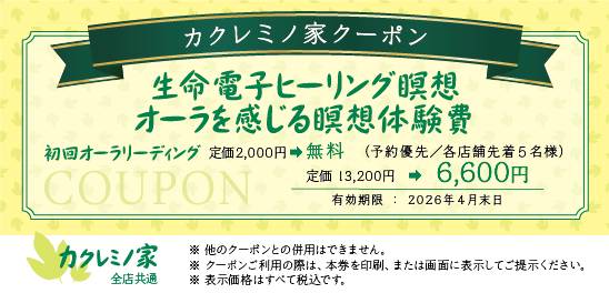 カクレミノ家では、様々なクーポンをご用意しています。 「クーポンを印刷する」ボタンからプリントアウトされたクーポンをご持参いただくか、 スマートフォンやタブレット等で直接お店のスタッフにクーポン画像をご提示ください。 また、他のクーポンとの併用はできませんので予めご了承ください。 2026年4月末日までの期間限定クーポンです。 ● オーラリーディング&パワーストーンブレスレット制作費 定価3,500円(税込)が1,500円(税込)になります。(石代別途/予約制/各店舗先着10名様) 2026年4月末日までの期間限定クーポンです。 ● チャクラリーディング&パワーストーンブレスレット制作費 定価4,500円(税込)が1,500円(税込)になります。(予約優先/石代別途/各店舗先着10名様) 2026年4月末日までの期間限定クーポンです。 ● チャクラブレイン瞑想 パーソナルレッスン体験 定価13,200円(税込)が6,600円(税込)になります。(予約優先/各店舗先着3名) 2026年4月末日までの期間限定クーポンです。 ● 生命電子ヒーリング瞑想 オーラを感じる瞑想体験費 定価13,200円(税込)が6,600円(税込)になります。(予約優先/各店舗先着5名) 2026年4月末日までの期間限定クーポンです。 ● 腸とへそヒーリング瞑想 初回オーラリーディング定価2,000円(税金) ⇨ 無料 定価13,200円(税込)が6,600円(税込)になります。(予約優先/各店舗先着5名様) 2026年4月末日までの期間限定クーポンです。 脊椎アロマヒーリング瞑想 初回オーラリーディング定価2,000円(税金) ⇨ 無料 定価16,500円(税込)が7,700円(税金)になります。(予約優先/各店舗先着3名様) ※こちらのクーポンは名古屋大須店ではご利用できません。ご了承ください。